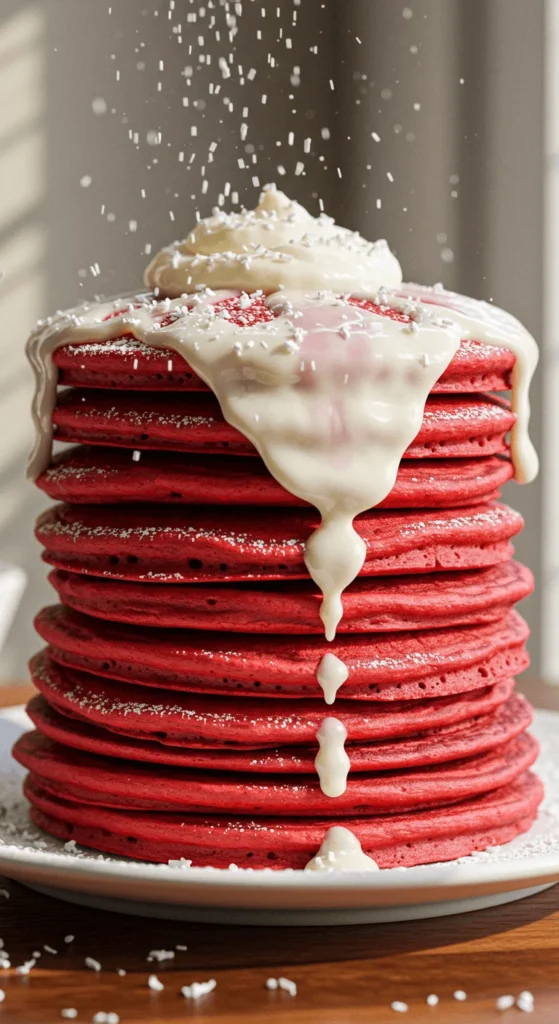 Red velvet feels festive with its bold color. Add cocoa powder and a little red food coloring to your batter. For a quick topping, mix cream cheese with powdered sugar and milk for a drizzle-style frosting. These pancakes look dramatic on the table, but they’re easy to make with everyday pantry staples. Kids love the color, and adults appreciate the chocolatey taste. Use store-brand coloring to save money—it works just as well as the expensive kind.