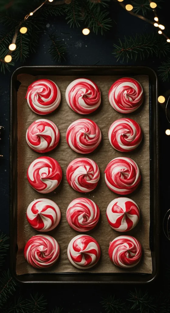 Meringues are light, airy, and easy to make. Whip egg whites with sugar until stiff, add peppermint extract, and pipe onto a baking sheet. For a candy cane swirl, brush red food coloring inside the piping bag. Bake at a low temperature until crisp.