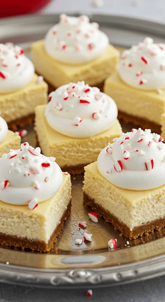 Cheesecake meets peppermint in these party-ready bites. Mix cream cheese, sugar, eggs, and peppermint extract. Bake in a lined pan, then cut into squares. Top with whipped cream and candy cane crumbs.