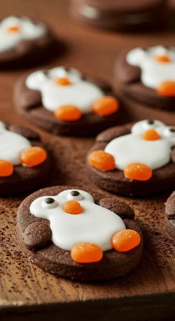 Penguins are a cute addition to a cookie tray. Use oval-shaped chocolate cookies as the base. Add a white icing belly, candy eyes, and small orange candies for the beak and feet. These are fun to decorate in bulk, and the design is forgiving for beginners. Kids will adore these little characters, making them perfect for family baking days.