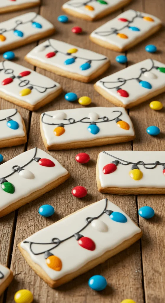 Use a rectangle-shaped cookie as the base. Pipe a black icing “cord” across the top, then add small colorful candies as the bulbs. The design is simple but festive. For a cheaper option, use mini M&Ms instead of specialty candies. These cookies are quick to decorate and look great laid out in rows on a platter.