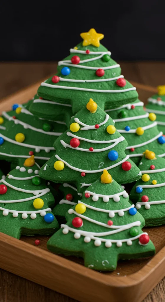 Shortbread cookies shaped like trees are simple but festive. Add green food coloring to the dough, cut into tree shapes, and bake. Decorate with white icing “garlands” and small candy “ornaments.” For a cheaper option, use mini chocolate chips instead of colored candy. These cookies are buttery, crumbly, and melt-in-your-mouth. Stack them into “cookie trees” as a centerpiece.