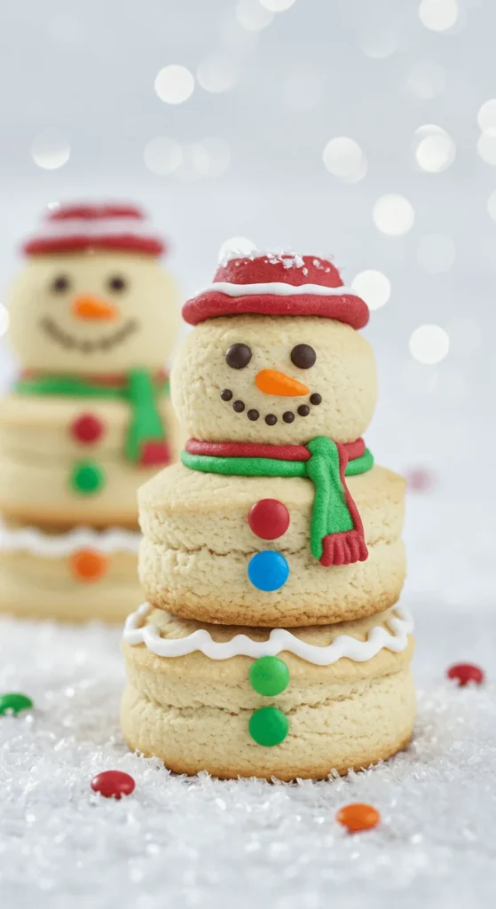 Make snowmen by stacking two or three round cookies. Use icing to connect the layers, then decorate with scarves, hats, and candy buttons. Mini chocolate chips work well for eyes and mouths. These cookies are affordable and easy for kids to decorate as a family activity. Use sandwich cookies filled with frosting for sturdier snowmen that hold together on a platter.