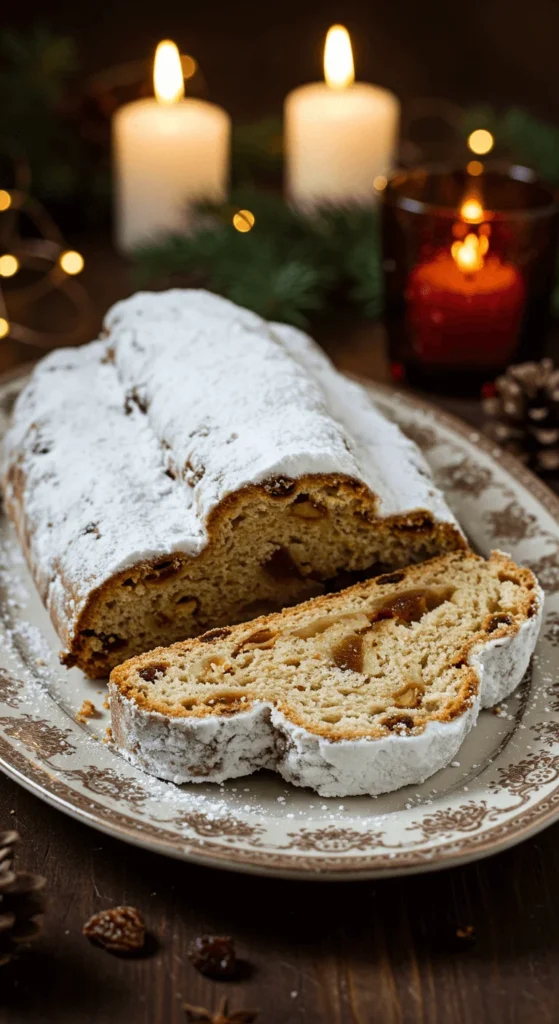 Stollen is rich with dried fruit, nuts, and spices. Powdered sugar on top gives it a snowy look. Dried fruit can be costly, so mix raisins with whatever you already have on hand. Bake it a few days before serving—the flavors improve as it rests. Wrap tightly in foil to keep it fresh.