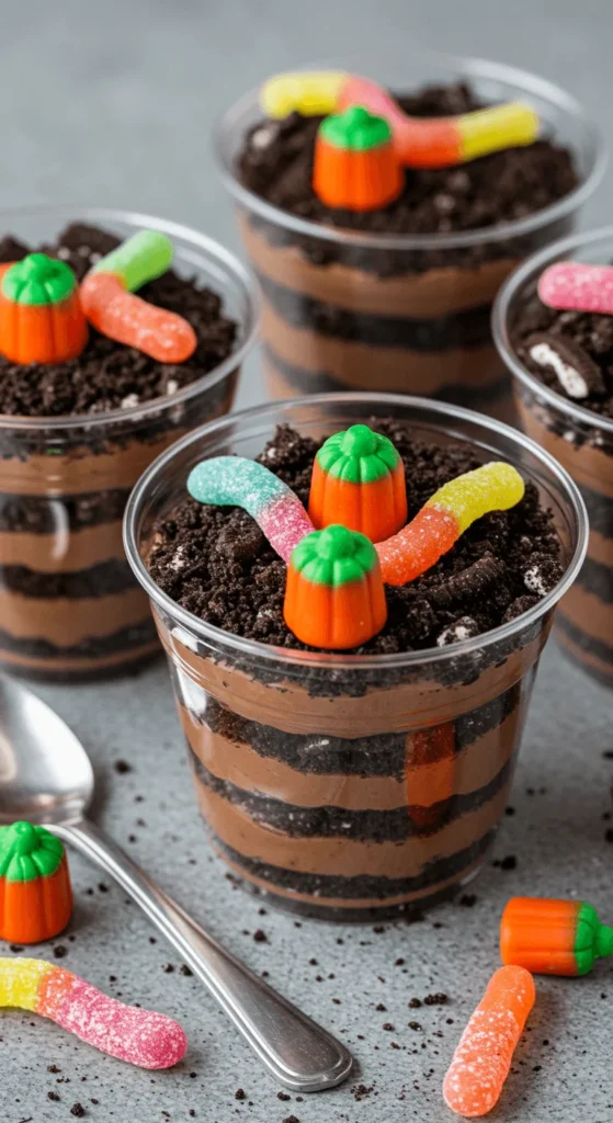 Layer pudding, Oreos, and gummy candies. Kids decorate with hands or bones sticking out like zombies. This dessert is inexpensive and quick to make.
