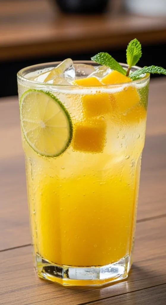 Blend mango with water and strain for a smooth base. Add sparkling water and lime juice. It turns out thick but still bubbly. Use frozen mango to save money. Add ice for a cooler sip. Lime slices make an easy garnish. This drink feels tropical and works well for themed parties.