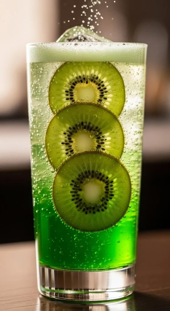 Blend kiwi with water and strain. Add sparkling water and lime juice. The drink tastes tart and bright. Frozen kiwi works if fresh is not available. Add a few kiwi slices for decoration. Serve cold with light ice.