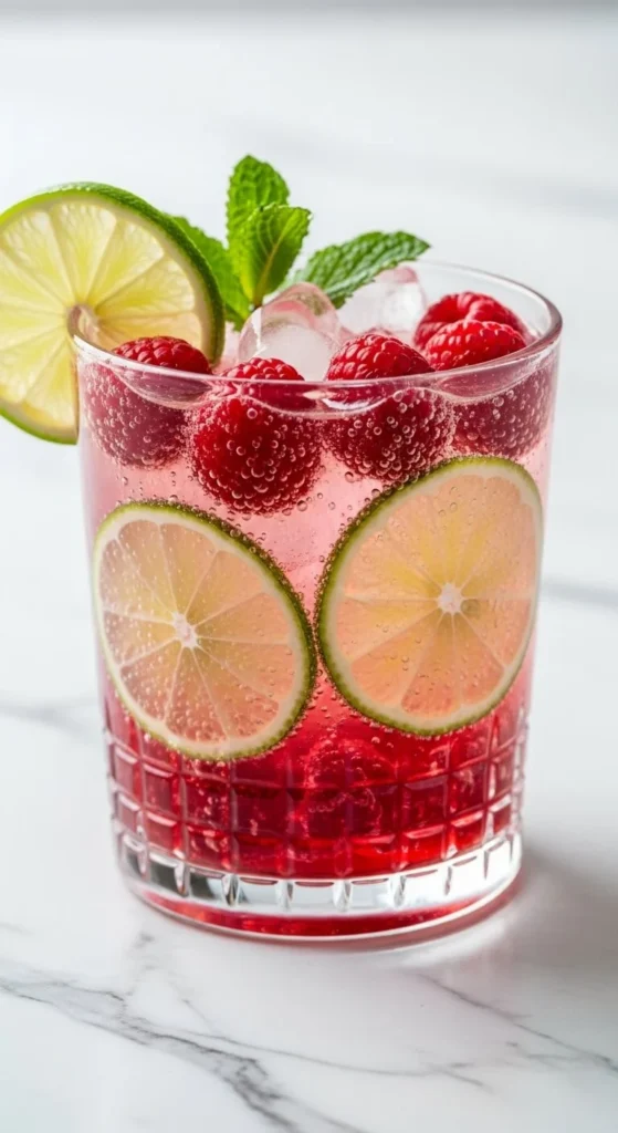 Mash a handful of raspberries in the bottom of each glass. Squeeze half a lime over the top. Add sparkling water to finish it off. The drink turns a bright pink shade that feels cheerful without extra sugar. If raspberries are expensive, use frozen—they work just as well and cool the drink at the same time. Stir gently, so the raspberry bits float up. Add more lime if you want a stronger citrus note. If you’re making this for kids, strain out seeds before serving. For larger gatherings, prep a bowl of lightly mashed berries in advance. Guests can spoon what they like into their glasses. This simple setup feels interactive and keeps you from mixing drinks all night. A lime slice on the rim adds just enough decoration.