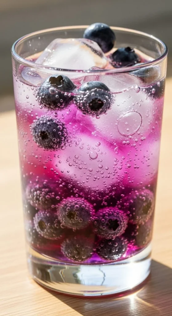 Heat blueberries with a little water until they soften. Mash slightly and strain for a dark berry syrup. Chill it, then add sparkling water. The color turns rich and bold. For a cheaper version, use frozen blueberries. Add ice only at serving time. Toss a few whole berries into each glass for decoration. You can prep the syrup hours ahead. Kids enjoy the sweet taste, and adults like its soft berry notes.