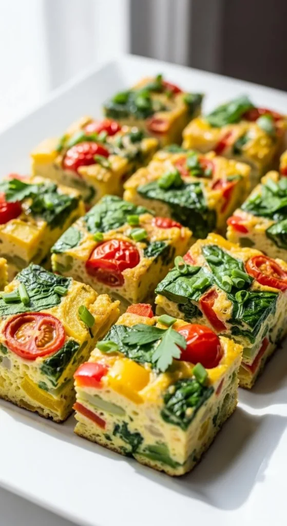 Whisk eggs with chopped veggies and cheese. Bake in a dish until set. Let it cool slightly before cutting into squares.