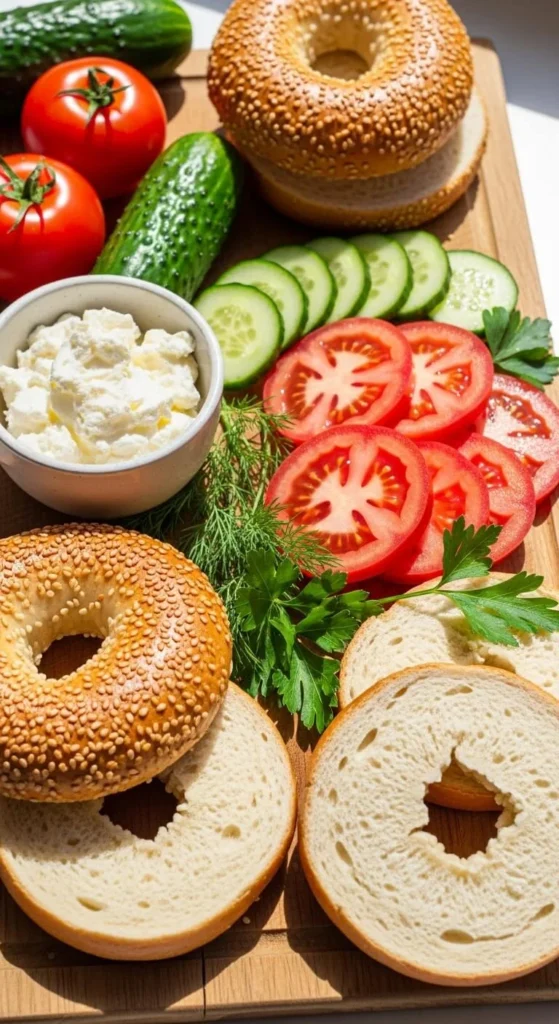 Slice bagels and lay out simple toppings: tomatoes, cucumbers, and cream cheese.
