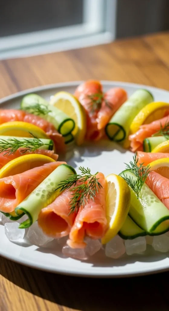 A salmon platter looks fancy without complicated steps. Buy a small pack of sliced salmon and spread it neatly on a plate. Add lemon wedges, thin cucumber ribbons, and a little dill.