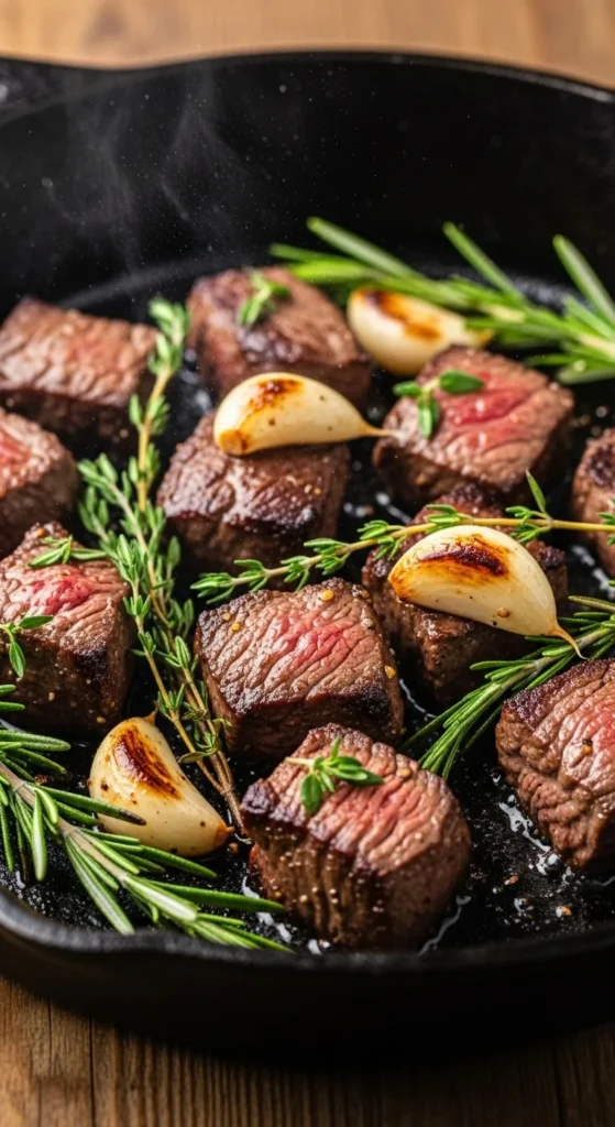 Steak bites cook fast and feel special. Cut steak into cubes and cook in a hot pan with garlic and butter. Serve with toothpicks or put them over mashed potatoes. Use sirloin for an affordable option. Keep batches small so the meat stays browned. Add parsley at the end for color.