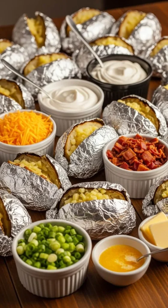 A potato bar is fun and easy for gatherings. Bake potatoes in batches. Set out toppings so guests can make their own versions. This works well for kids and adults. Use simple toppings like cheese, green onions, and leftover chicken. Add a few fancier ones like caramelized onions or garlic butter. To save money, buy a big bag of potatoes—they feed a crowd for very little. Use slow cookers to keep them warm until serving time.