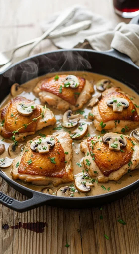 This dish cooks in one pan, which makes cleanup easy. Brown chicken pieces first, then add mushrooms, garlic, and cream. Let it simmer until thick. Serve with rice, mashed potatoes, or pasta. For a cheaper option, use chicken thighs—they stay juicy. Add frozen peas for color. You can make it earlier and reheat gently before dinner. A squeeze of lemon at the end brightens the flavor without extra cost.