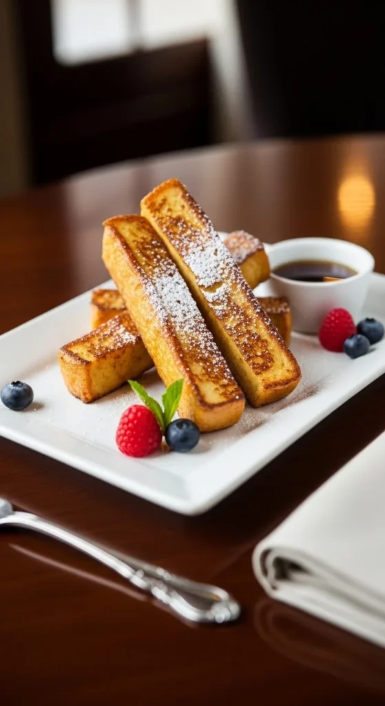 [Image Prompt: French toast sticks with crisp edges, plated neatly, high-end camera, no text or words.]