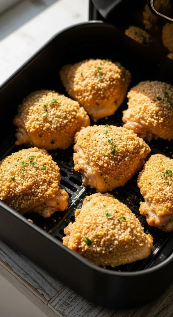 Coat thighs with Parmesan and breadcrumbs. Cook at 380°F for 20–22 minutes.