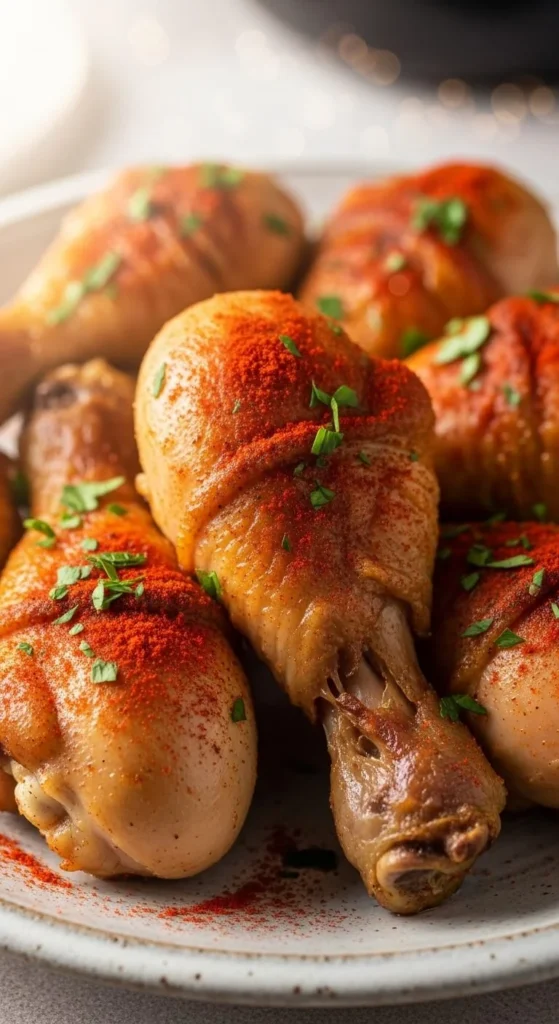 Season drumsticks with paprika, salt, and oil. Cook at 380°F for 25 minutes.