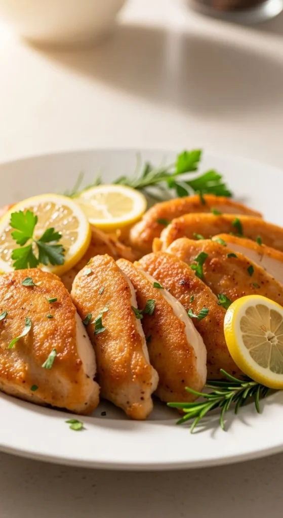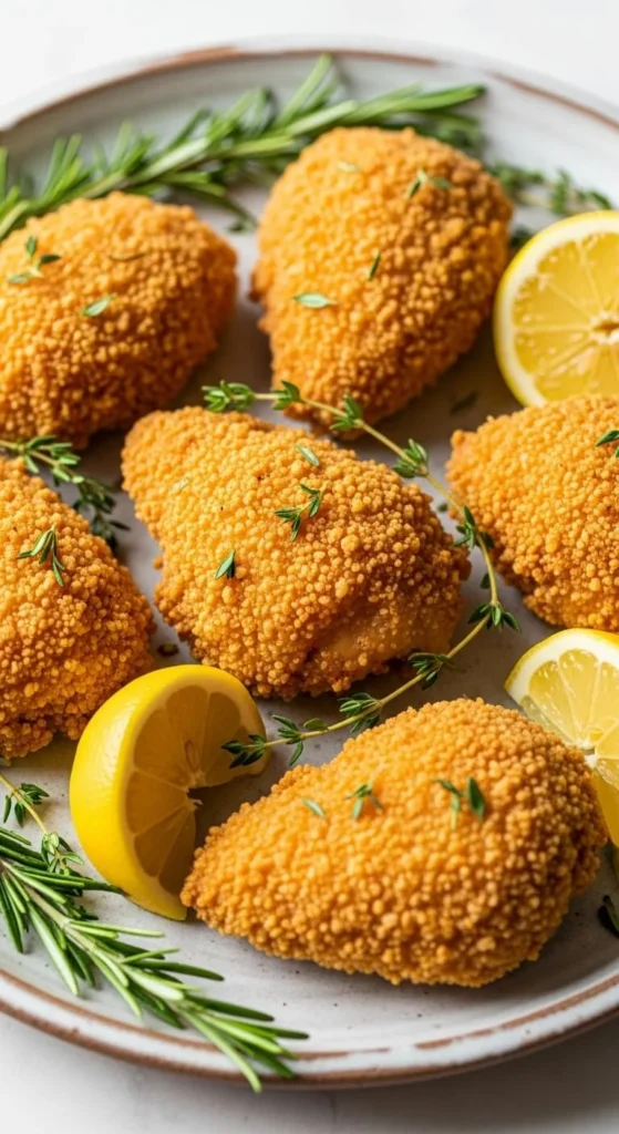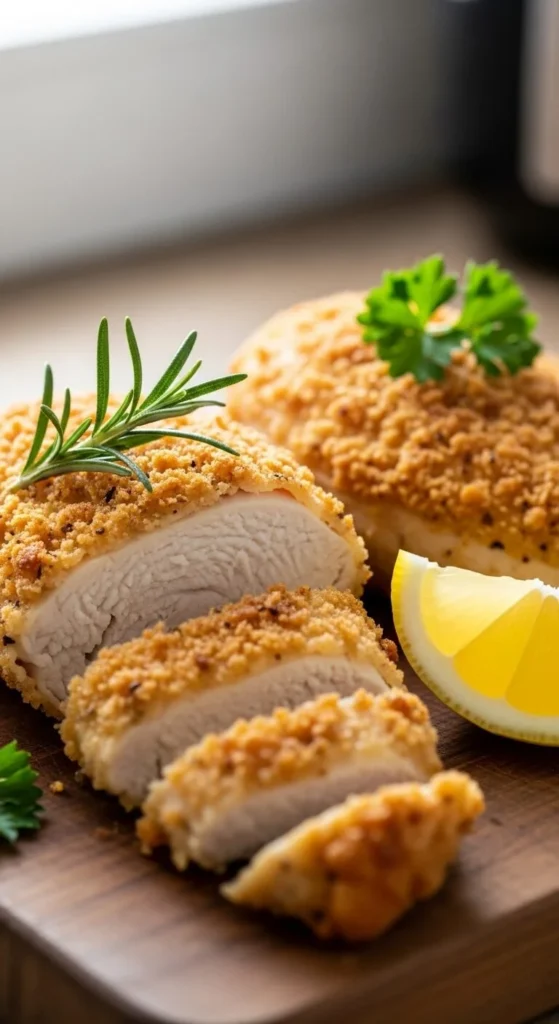 Flatten chicken breasts, coat in breadcrumbs mixed with fresh herbs. Cook at 400°F for 12–14 minutes.
