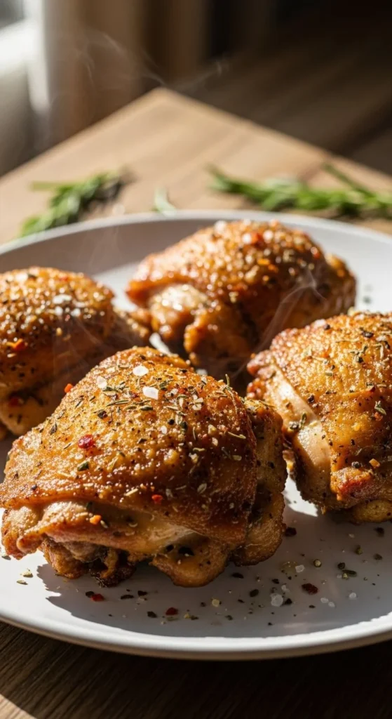 Mix breadcrumbs with Italian seasoning. Coat thighs lightly and air fry at 380°F for 20 minutes.