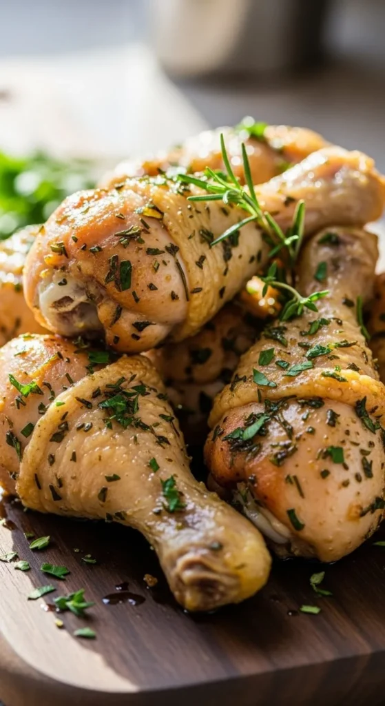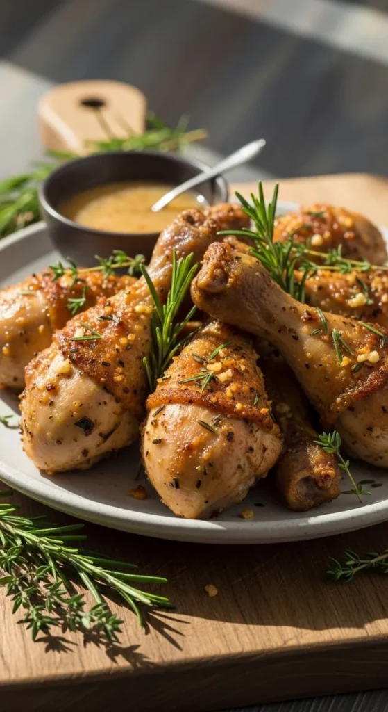 Season drumsticks with minced garlic, herbs, and a touch of oil. Cook at 380°F for 25 minutes.