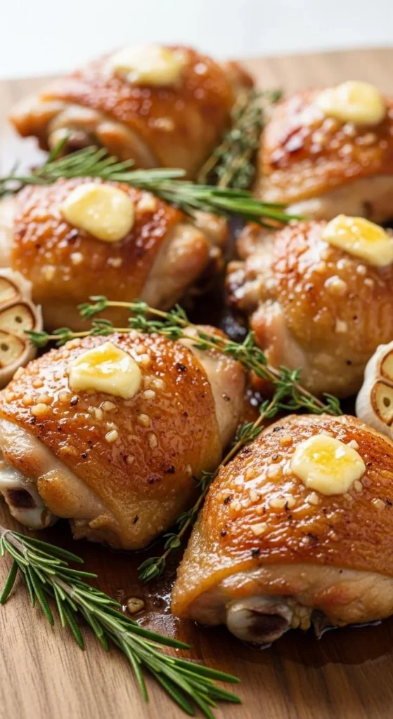 Season chicken thighs with salt and pepper. Cook in the air fryer at 375°F for 20–22 minutes. Brush with garlic butter before serving.