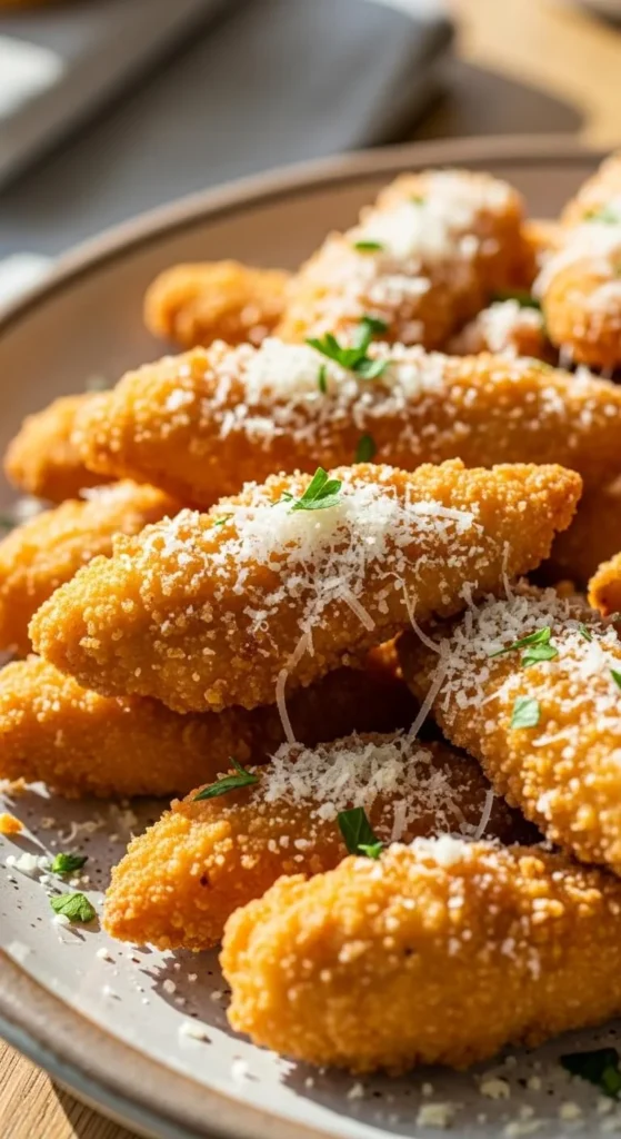Coat tenders in a mix of Parmesan, garlic powder, and breadcrumbs. Air fry at 400°F for 12–15 minutes.