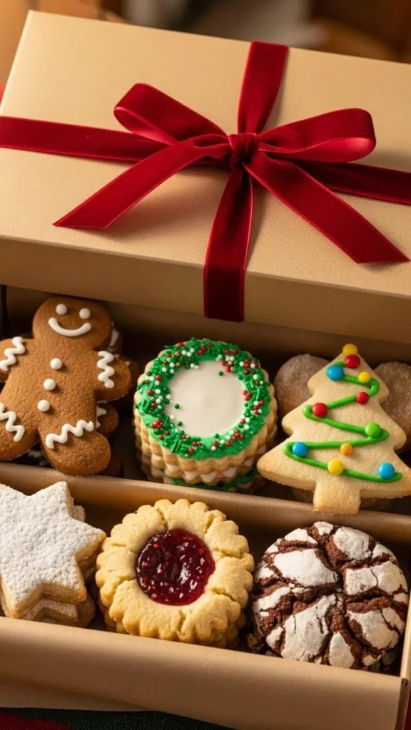 Use cookies with simple rustic finishes—oatmeal cookies, cinnamon stars, or almond crescents. Add a few pine sprigs around the edges for decoration. Tie twine around the outside for an easy finish. Wooden crates can be reused as home decor, so they feel extra thoughtful. Check thrift or craft stores for small crates in bulk.