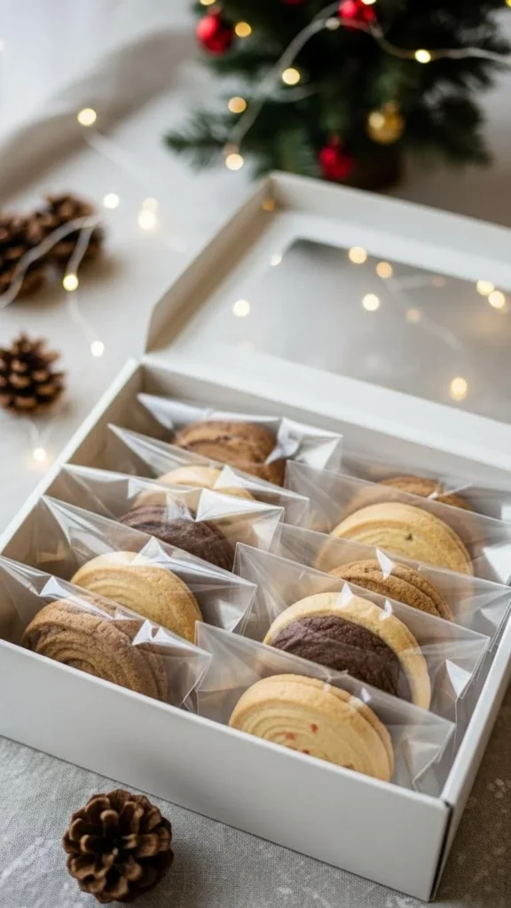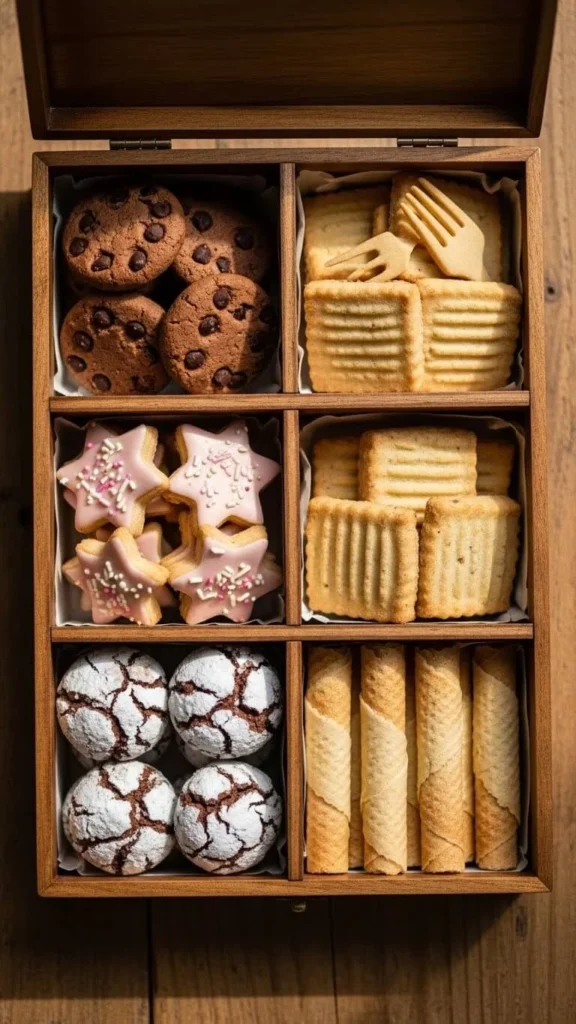 Add a dusting of powdered sugar before packing. Line each insert with mini cupcake liners to match the color scheme. This creates a tidy grid that’s fun to open. It’s a great option when gifting kids or families since they can grab one cookie at a time.