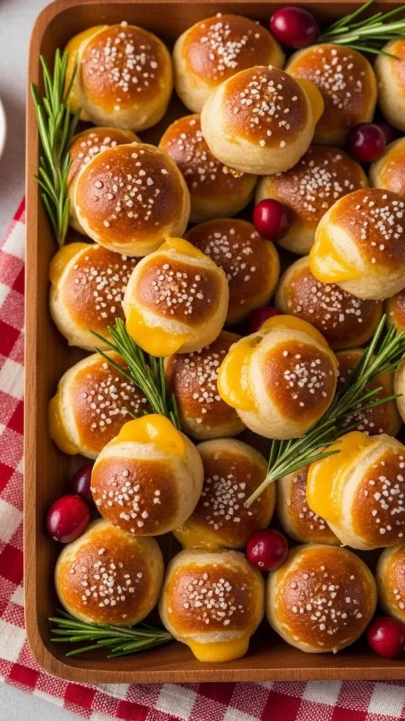 Use pizza dough to make tiny dough balls stuffed with cheese. Boil briefly in baking soda water for that classic pretzel flavor, then bake. These taste warm and comforting. Serve with mustard or cheese dip. Make extra—they disappear fast.