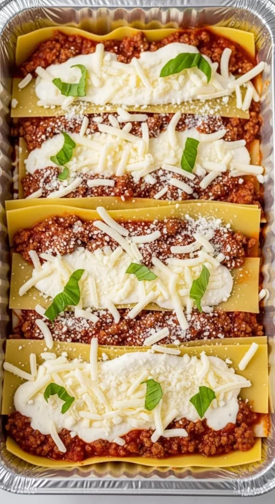 Assemble lasagna in a foil pan.