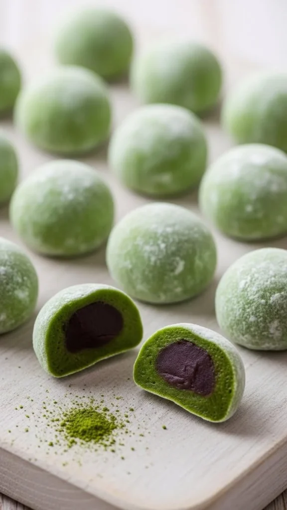 Green tea mochi bites use glutinous rice flour. Mix with sugar, water, and matcha. Steam or microwave until sticky. Shape while warm. Dust with starch. For fillings, use sweet bean paste or nut butter. Make small pieces. They feel filling fast. Rice flour costs little and lasts long. Store mochi covered to keep soft.