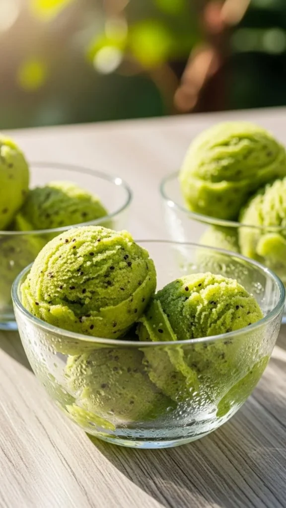 Kiwi sorbet uses fruit, sugar, and water. Blend until smooth. Freeze and stir a few times. For ease, use an ice cream maker if available. For savings, buy ripe kiwi in season. The color stays bright. Serve in chilled bowls. Add a mint leaf if desired.