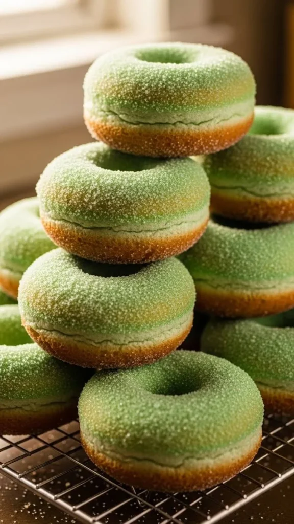 Mint sugar donuts bake instead of fry. Mix a simple batter. Add mint extract and green coloring from plant powder. Bake in a donut pan. Toss warm donuts in sugar. For budget swaps, use a muffin pan. Shape holes with foil. These donuts taste best same day. Serve warm if possible.