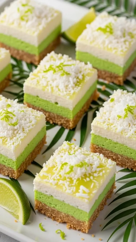 Lime coconut squares bring a bright green center and a soft bite. Lime juice and zest give the color. Mix them with eggs and sugar. Pour over a baked coconut crust. The crust uses shredded coconut and flour. Press it in with a glass. Bake until just set. The center should jiggle slightly. Cool fully before cutting. For savings, use bottled lime juice for most of the liquid. Add fresh zest for aroma and color. These squares taste chilled. Store them in the fridge. Dust with powdered sugar or extra coconut. Cut them small. The flavor pops even in small bites. They work well for warm days. The coconut balances the sharp lime. No mixer needed. A whisk does the job.