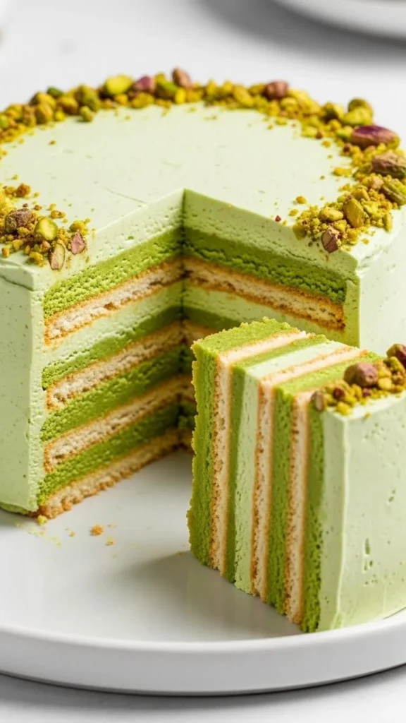 Pistachio icebox cake skips the oven. Whip cream with sugar. Fold in pistachio paste or ground nuts. Layer with plain biscuits or crackers. Chill overnight. The layers soften into a cake-like slice. For budget swaps, use graham crackers. Make pistachio paste at home with nuts and oil. Blend until smooth. The green color looks clear between layers. Slice with a hot knife for clean edges. This dessert suits warm days. It feeds a crowd with little effort. Add crushed nuts on top for texture.