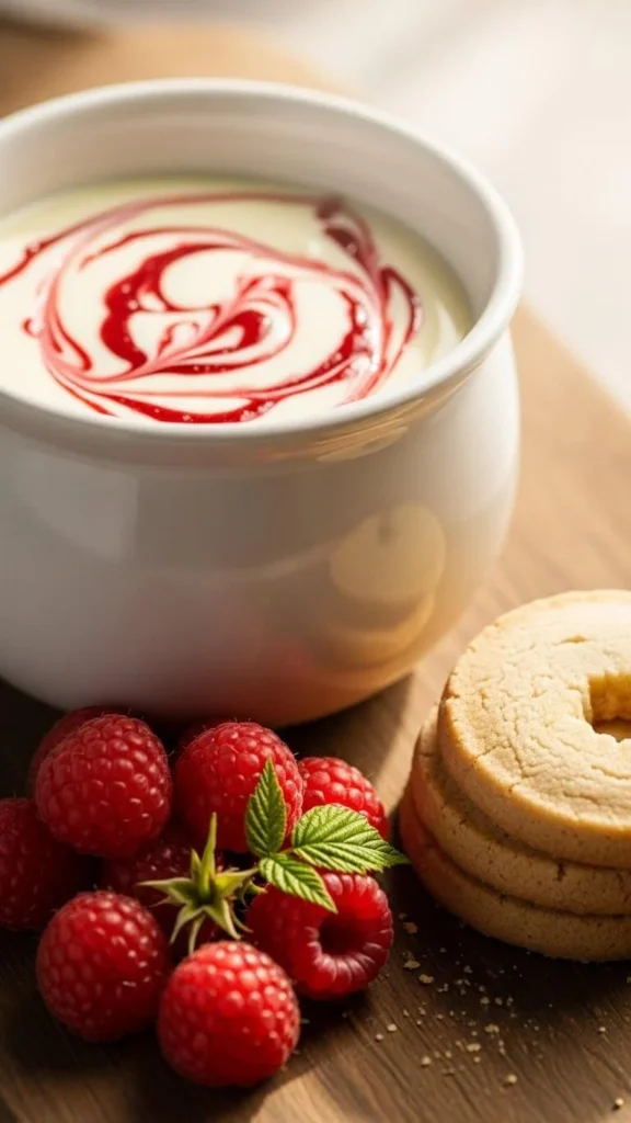 Serve with berries, wafer cookies, or soft cake pieces. If the chocolate thickens, mix in warm cream. This fondue looks bright and feels festive, making it great for holiday dessert tables.