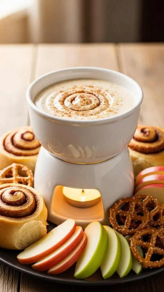 Serve with mini cinnamon rolls (store-bought works fine), fresh apple slices, or graham crackers. Add a pinch of nutmeg for a cozy smell. If it thickens, whisk in a spoonful of warm milk. This fondue is simple to make and usually becomes a holiday favorite for kids.