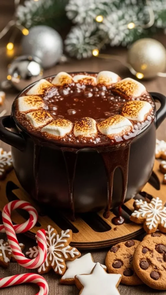 Set out candy canes, cookie sticks, or sponge cake cubes. You can flavor the pot with a tiny drop of peppermint extract. Keep the pot warm but not too hot to avoid scorching. Add fresh marshmallows to the top halfway through so everyone gets a warm scoop now and then.