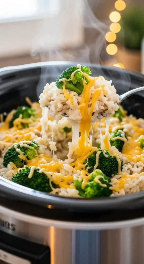 This is a filling side dish. Mix rice, broth, broccoli, and cheese. The cooker softens everything into a comforting bowl. Use frozen broccoli to save money and prep time. Add diced onion for extra flavor. Serve with chicken or ham. Leftovers work well for next-day lunches.