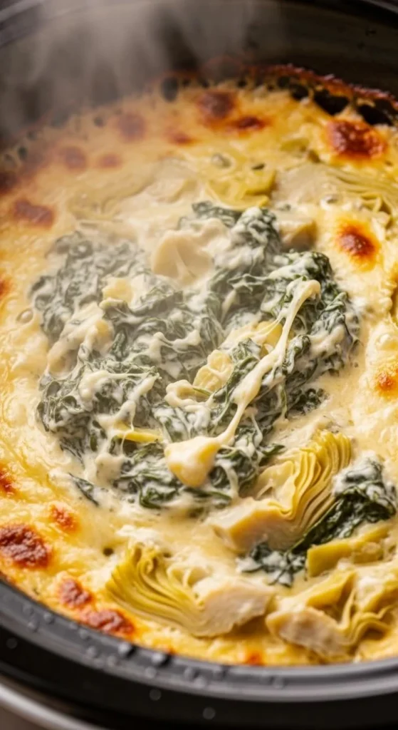 This dip works for parties or family nights. Mix cream cheese, spinach, artichokes, and spices. Let it soften into a warm dip. Serve with chips, bread, or vegetables. Use frozen spinach to save money. Keep the cooker on warm mode so guests can snack as they please.