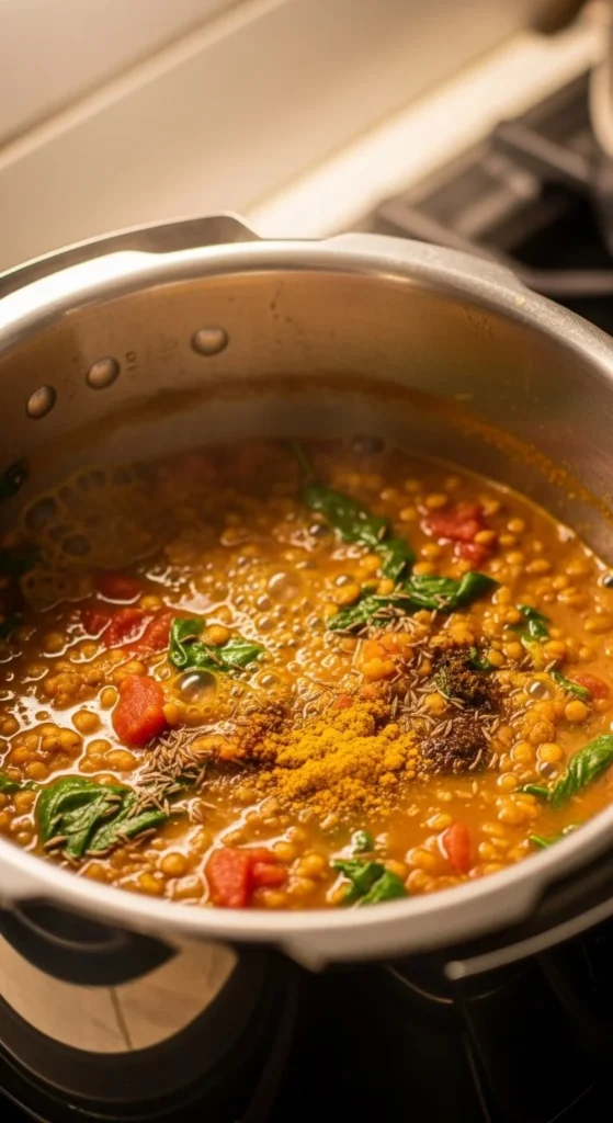 Add dry lentils, canned tomatoes, spices, and water. Pressure cook for 15 minutes.