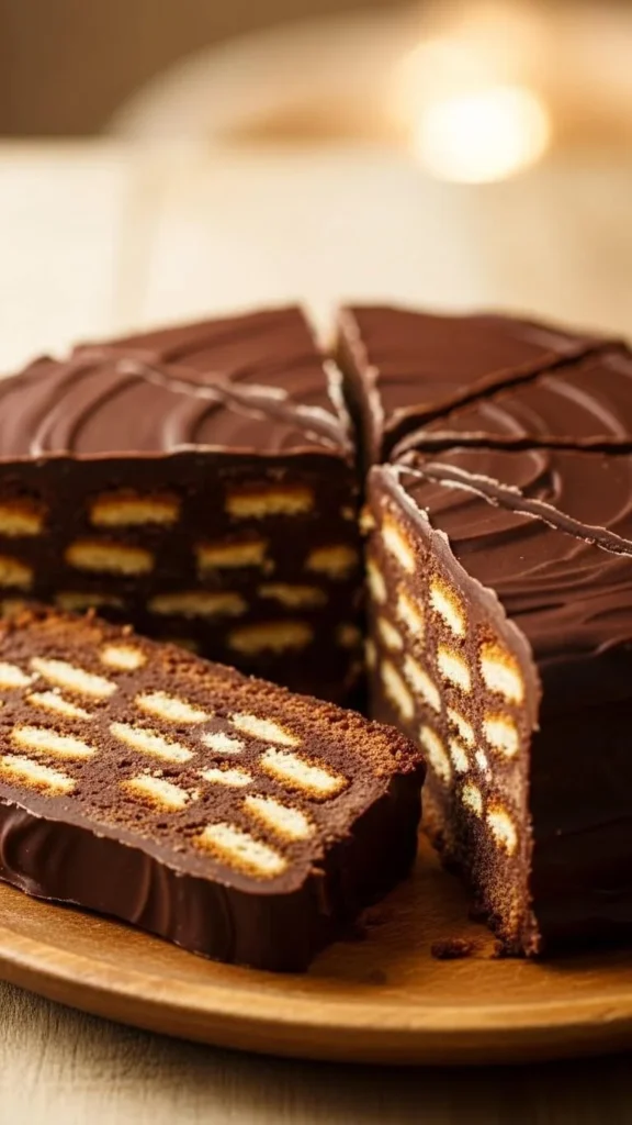This cake skips baking. Melt chocolate. Mix biscuits.