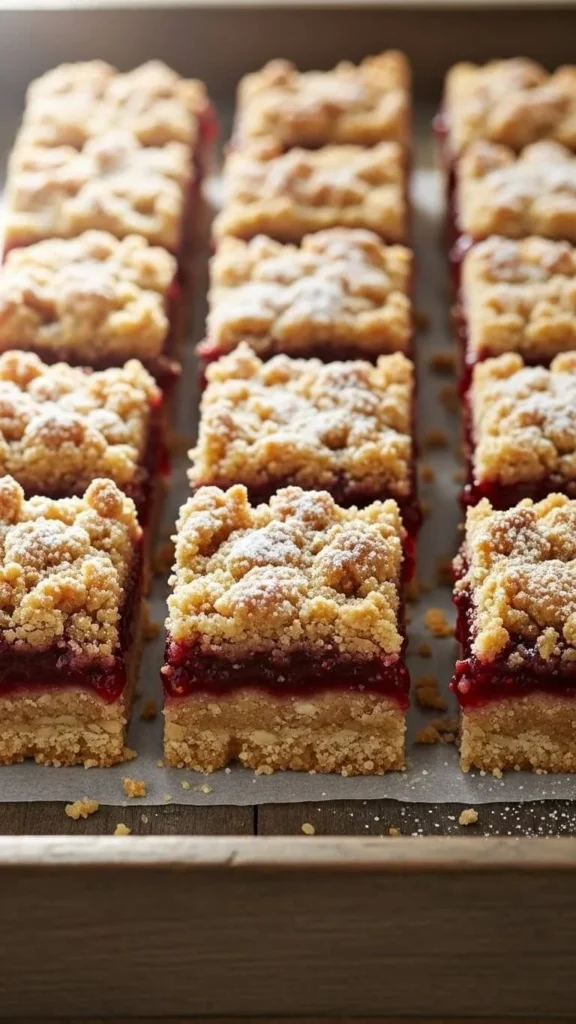 Jam squares use a buttery base and any jam you have. Spread jam. Crumble topping. Bake until set.