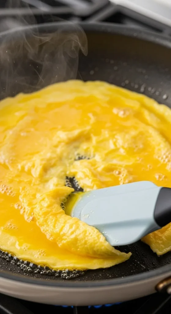 4. Gently pull the edges inward with a spatula, allowing uncooked egg to flow underneath.