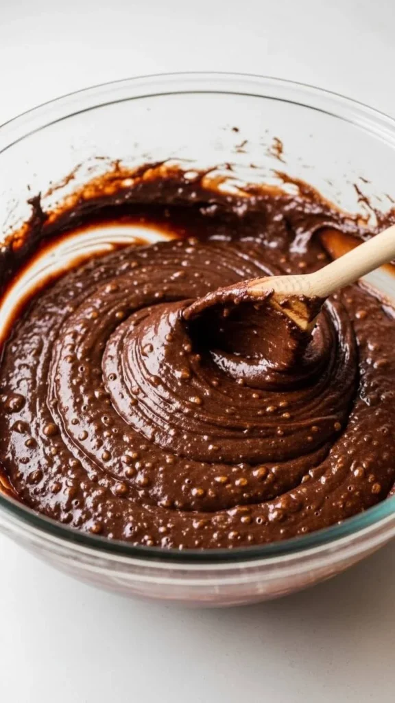 Mix just until combined. Don’t overmix—this keeps the brownies dense and fudgy.