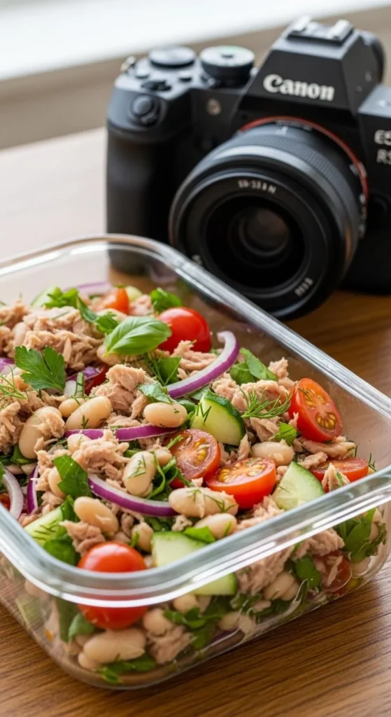 Mix canned tuna with white beans and chopped vegetables.