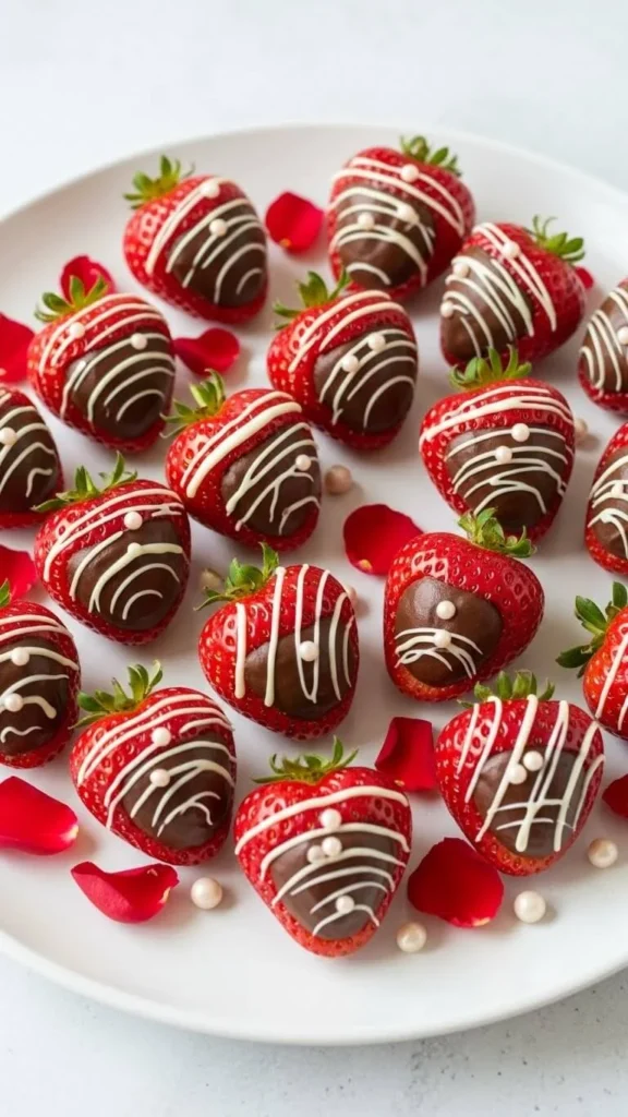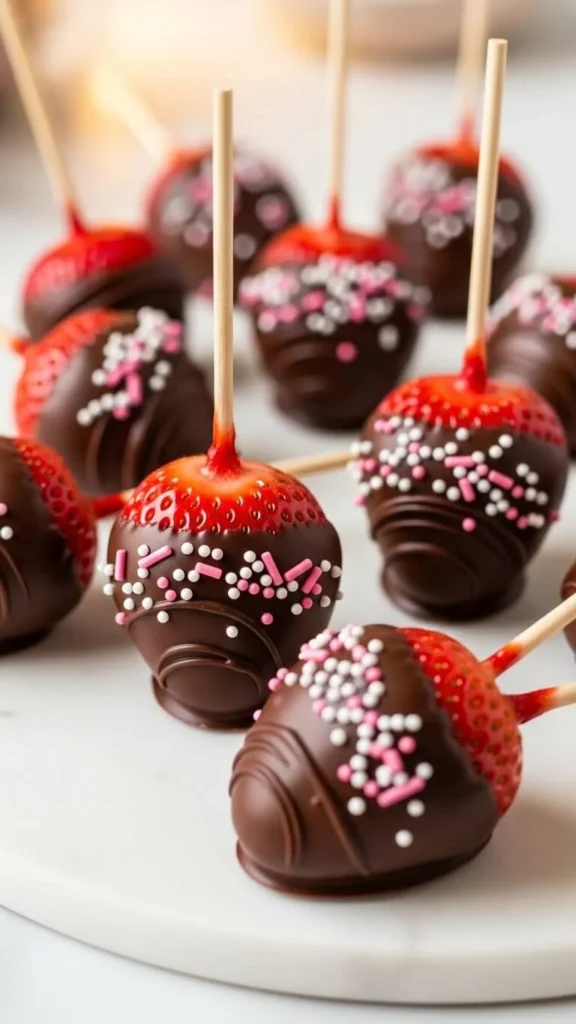 Chocolate-dipped strawberry pops feel romantic but stay very simple. Start with ripe strawberries. Wash and dry them fully so the coating sticks well. Melt dark or milk chocolate using a bowl over warm water. Dip each strawberry and place it on parchment paper. Add crushed nuts or coconut if you like texture. Insert small sticks before the chocolate sets.