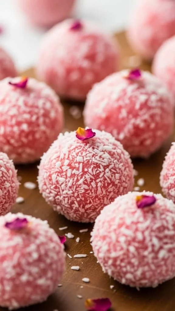 Mix shredded coconut with condensed milk and rose syrup. Roll into small balls. Chill briefly.