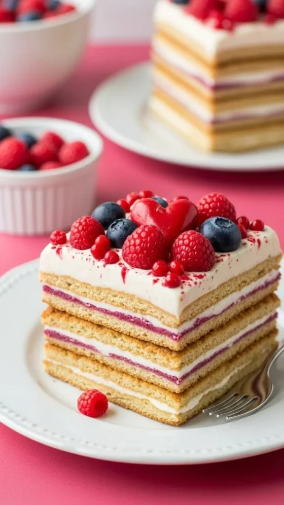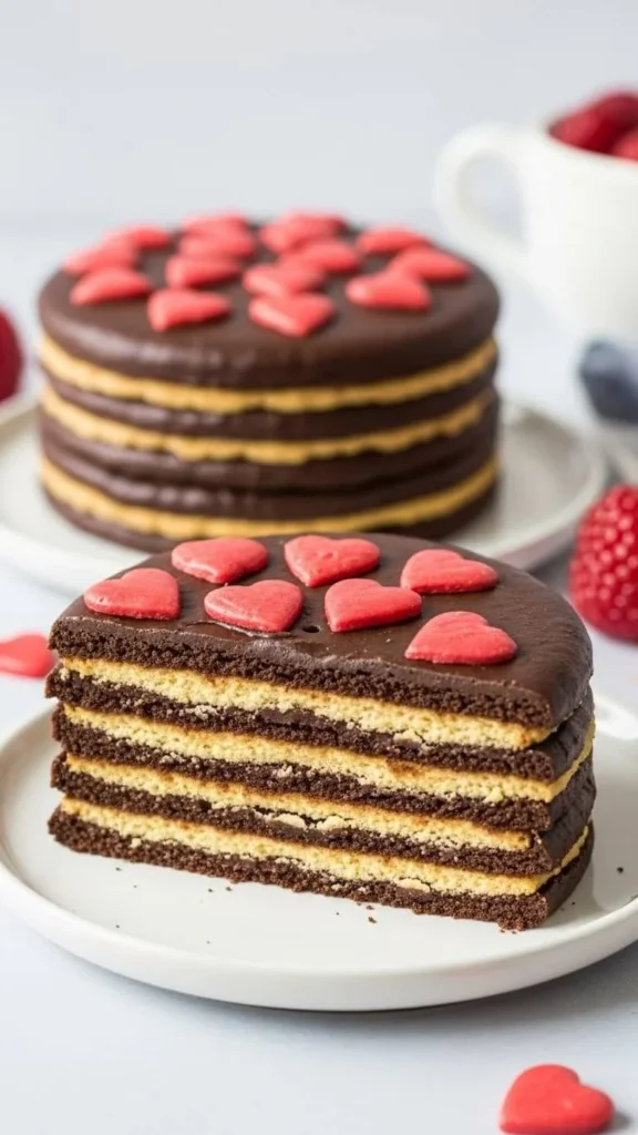 Icebox cake uses layers of biscuits and cream. Dip biscuits briefly in milk. Layer them with whipped cream in a dish. Shape the top into a heart.